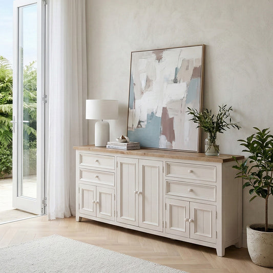 Made from solid, reclaimed pine, products in our Byron collection feature timber tops with a rustic tawny stain and ivory washed bases. The timber tops have been authentically aged to achieve a weathered, rustic appearance.