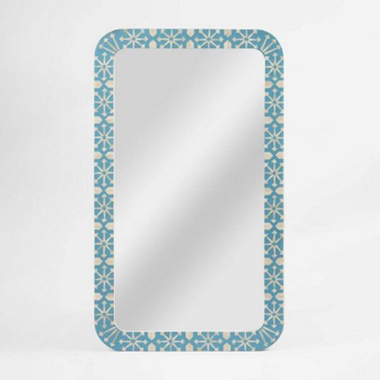 The delightful Adina bone inlay mirrors are the perfect way to make a statement in any interior space. The intricately designed pattern encases the mirrored glass to a wonderfully effect, we're convinced that everything looks better in this mirror! Available in Aqua/White, Peach/White & Grey/White colourways. Handcrafted from ethically sourced buffalo bones in India, each piece is unique. The time-honoured artisinal craft of Bone Inlay was originally created for the royal palaces of Rajasthan, India. With each piece taking months to complete, intricate fragments of buffalo bones are hand-carved and affixed onto the surface in a mosaic-like design. Resin is then used to fill the space around the bone.
