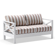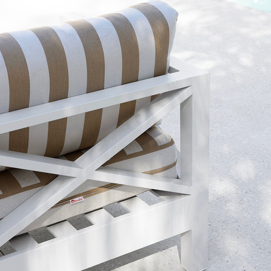 Featuring a 2 seater sofa, two generous armchairs, and a beautifully finished coffee table, this 2+1+1 setting brings relaxed refinement to any alfresco space. The crisp white frame paired with Sunbrella® cushions in Heather Beige offers a soft, timeless look that elevates any outdoor retreat.