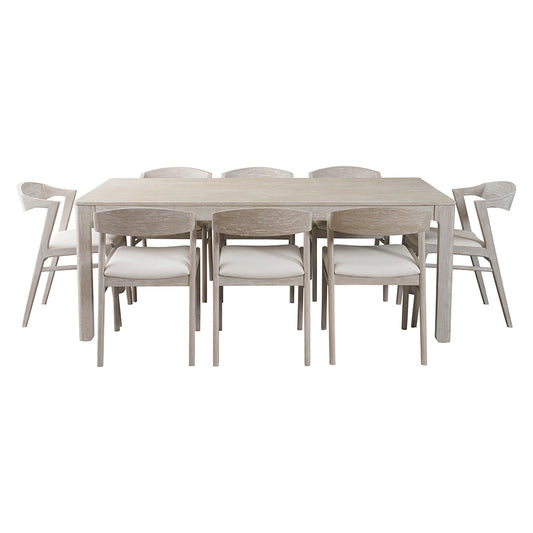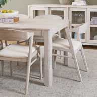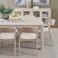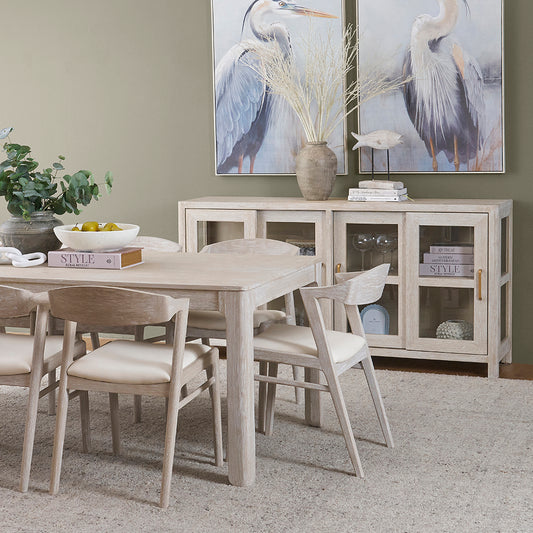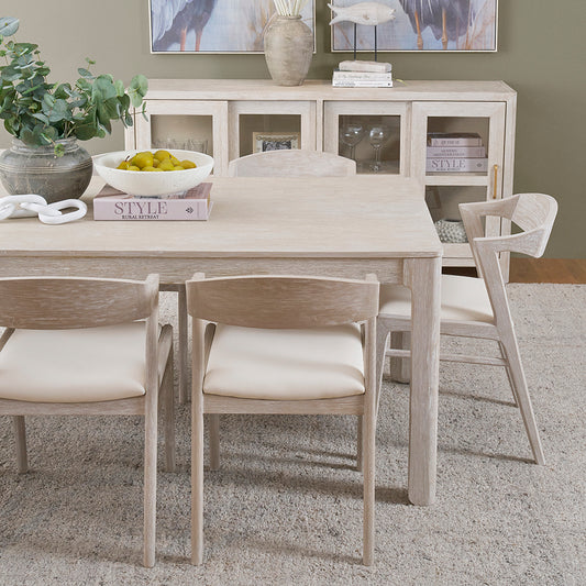 Crafted from durable acacia timber, the generous table features a sleek, angular silhouette softened by a wire-brushed white-washed finish. The lightly textured surface brings subtle coastal character and depth while remaining practical and forgiving—perfect for busy family dining.
