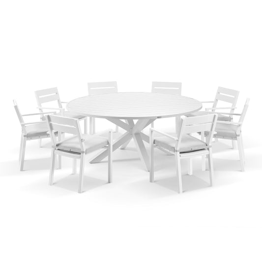 Beachport Outdoor 1800 Round Aluminium Dining Set with 8 Kingscliff Chairs White/Textured Olefin Grey