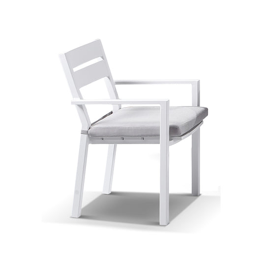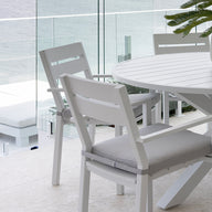 The table’s sculptural base is as strong as it is stylish, crafted from powder-coated aluminium to deliver long-lasting durability. Paired with the Kingscliff Chairs — which combine lightweight construction with sleek, modern lines and textured Olefin cushions — this setting is designed for comfort, versatility, and everyday ease.