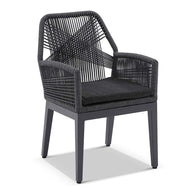 Complementing the table are the Lorne dining chairs, featuring curved lines, supportive armrests, and a contemporary twist with polypropylene rope detailing. Carbon grey Olefin cushions add comfort and charm, while the powder-coated aluminium frame ensures lasting stability and resilience.
