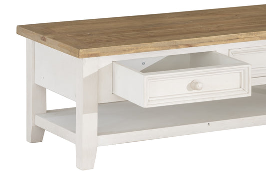This coffee table features two double drawers with a timber knobs, as well as a shelf underneath.
