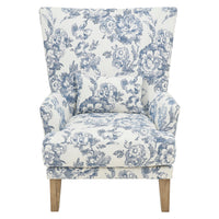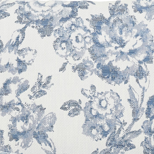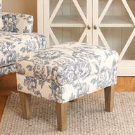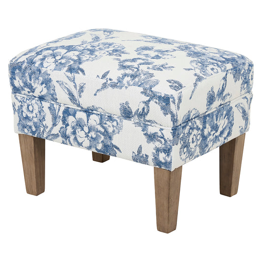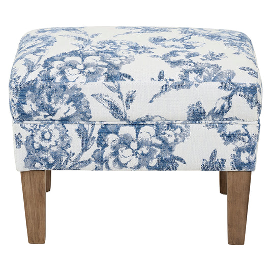 This statement ottoman features a timeless large floral pattern in ocean blue on an ivory background. The durable upholstery fabric is composed of 47% polyester and 53% rayon and has been carefully selected to complement Hamptons-inspired styling.The frame is made of a combination of solid pine rails and plywood.