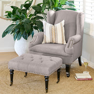 Exclusive to 1825 interiors, this classic wing chair & ottoman combination were designed by us to complement virtually any décor with their neutral fabric, dark timber castors, and brass rivet detailing.
