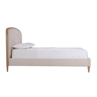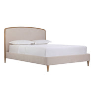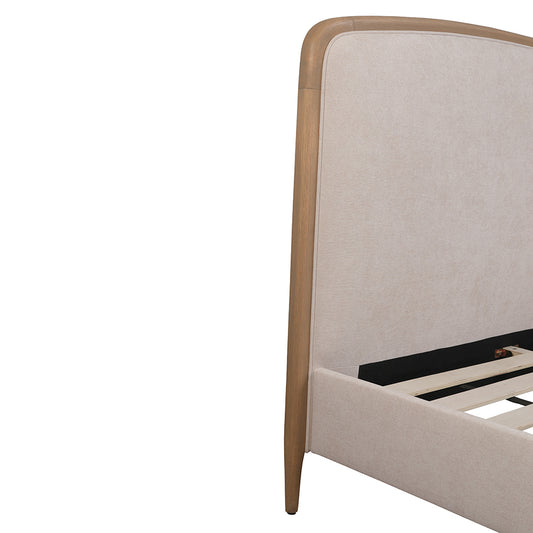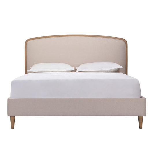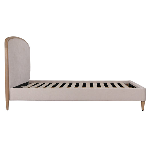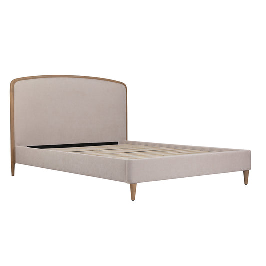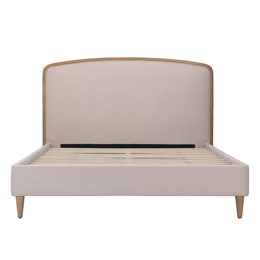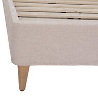 Upholstered in a natural-toned 100% polyester fabric with a stylish timber trim and tapered natural wooden legs, this bed frame provides a neutral, timeless base for decorating your bedroom.