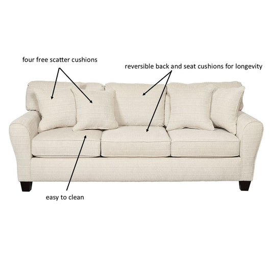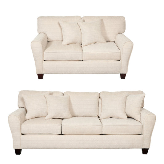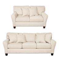 This sofa set features reversible coil spring seat cushions for longevity, dark timber legs, and a durable 100% polyester cream fabric. The back cushions are made of 100% polyester fibre, and are also reversible. Each sofa comes with two scatter cushions in the same fabric as the sofa.