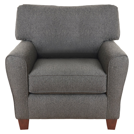 This armchair features reversible coil spring seat cushions for longevity, dark timber legs, and a durable 100% polyester charcoal fabric. The back cushion is made of 100% polyester fibre, and is reversible.