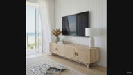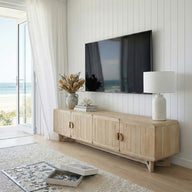 Expertly crafted from premium rubberwood in a natural finish with half moon handles, this Scandi-style large TV unit features sleek lines and minimalist details, ensuring that it will complement almost any interior style.