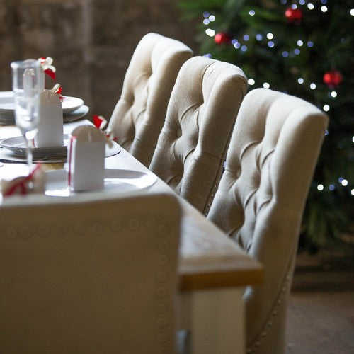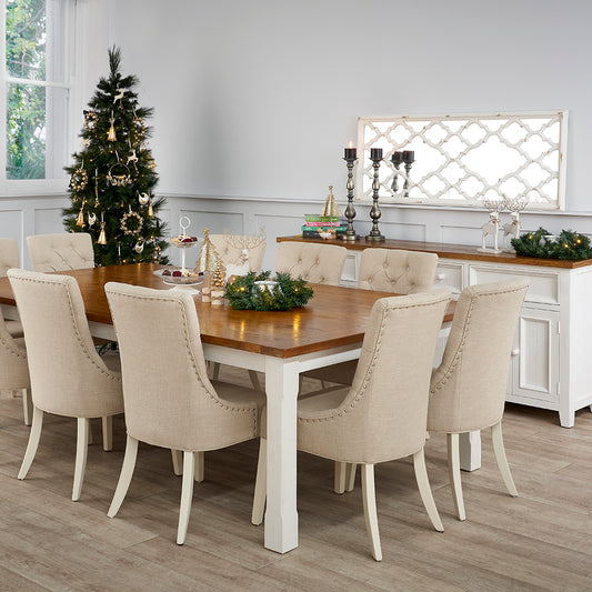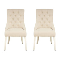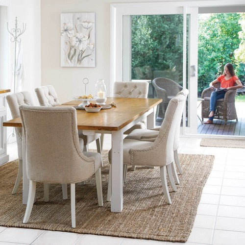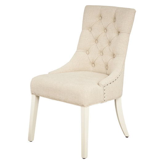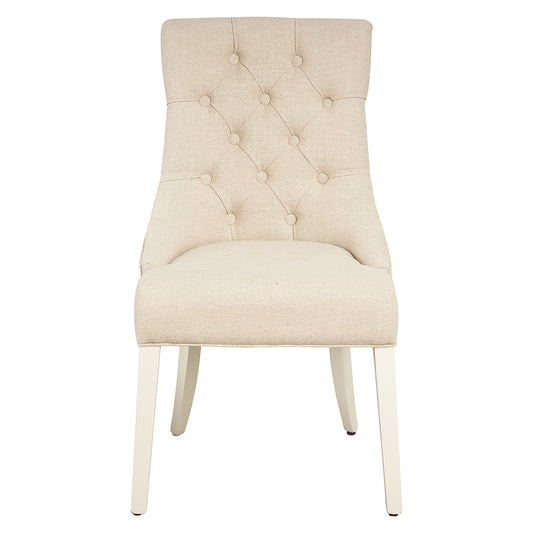 Add comfort and style to your dining experience with this button back dining chair. It features a hardwood frame with ivory-washed birch legs and a 45% cotton/55% linen blend fabric, and it works perfectly with timber dining tables.