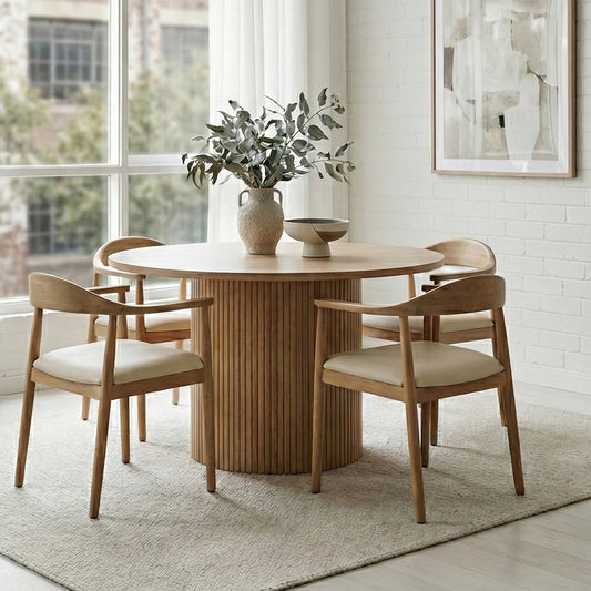 This package consists of the Lux 1300 round dining table and 4 x Lux dining armchairs with off white seat cushions.