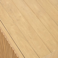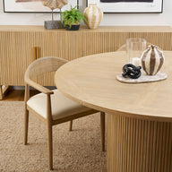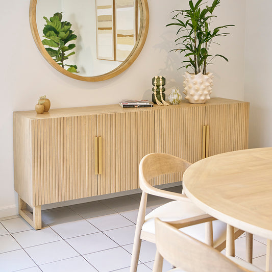 Its smooth top offers a refined finish, beautifully balanced by the subtle fluted detailing on the doors, adding texture and charm. A timeless addition to any dining space.
