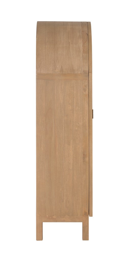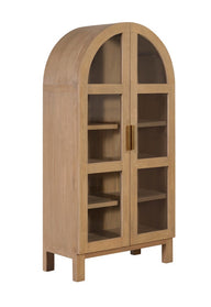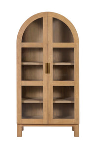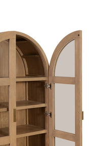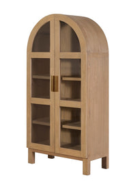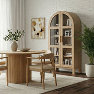 Expertly crafted from durable rubberwood and new pine in a warm natural finish, this tall and striking cabinet features two arched glass doors that create a sense of lightness while beautifully showcasing your favourite items. From treasured collectables and decorative pieces to curated glassware or books, every item inside becomes part of the overall design story.