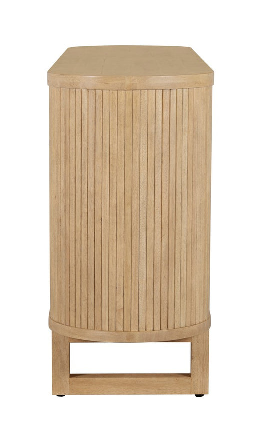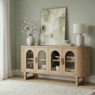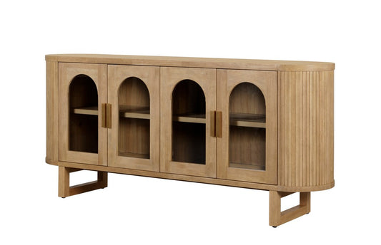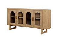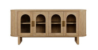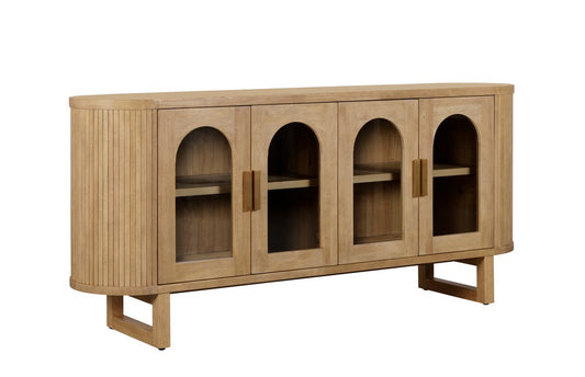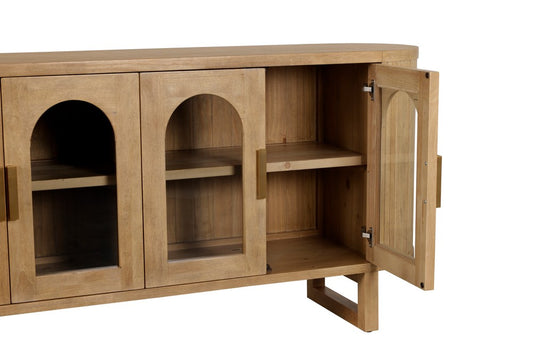 Expertly crafted from durable rubberwood, new pine and plywood in a warm natural finish, this striking sideboard features four arched glass doors that showcase your favourite pieces while keeping the look light and refined. The smooth top surface offers a perfect platform for styling, while the rounded, fluted sides and curved profile add layers of texture and sophistication.