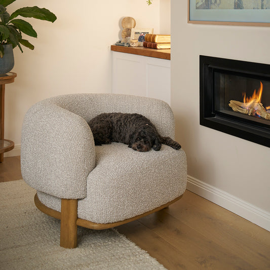 Its rounded shape exudes mid-century vibes that work in almost any setting. Plus, its  beige fabric upholstery is warm, snuggly, and durable.