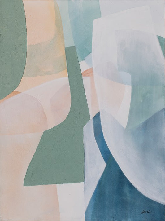 This image is an abstract painting featuring a composition of overlapping shapes and colours. The painting includes soft hues of green, blue, beige, and white, creating a harmonious and balanced visual effect. The shapes are irregular and fluid, blending into one another without distinct boundaries. The overall aesthetic is modern and minimalist, evoking a sense of calm and contemplation.
