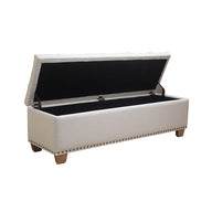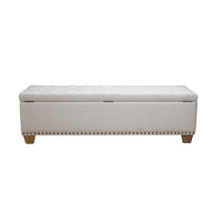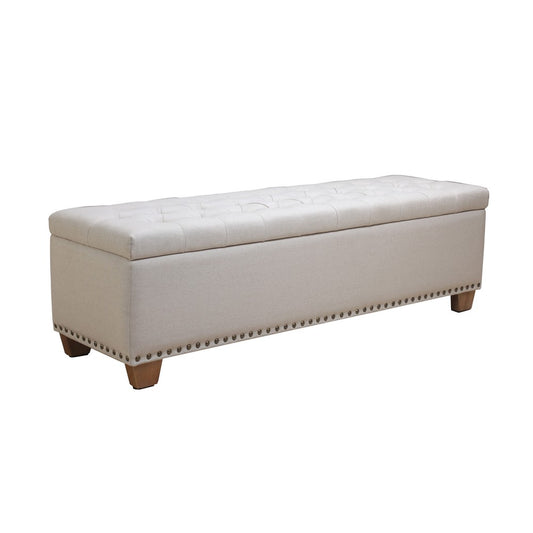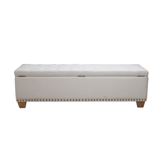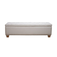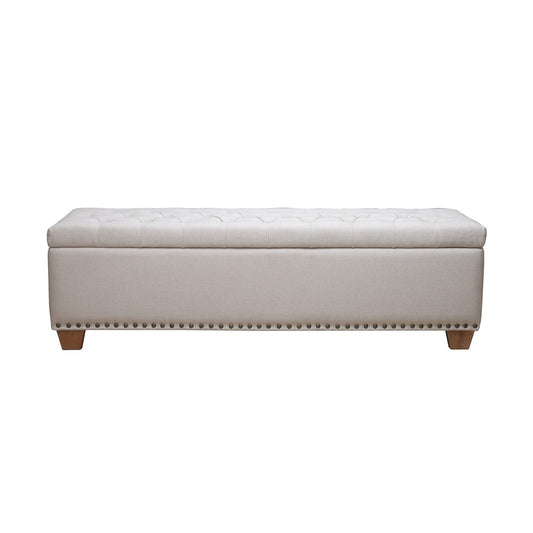 Hand tufted and richly upholstered in a neutral linen/cotton fabric, the French provincial style Angelique storage ottoman is an opulent addition to any bedroom.