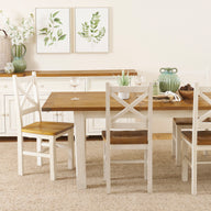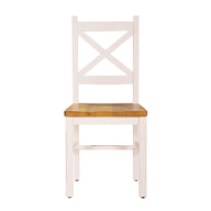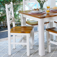 Our two-tone Newport collection is made from carefully chosen solid, reclaimed pine shipping pallets. There is a cross design on selected pieces, as well as an inlaid timber bow detail on the table top corners. The pieces are finished with a honey-coloured stain and our signature ivory wash.