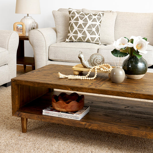Made from reclaimed pine with a Golden Sienna stain, products in this collection have plenty of colour variation, giving each piece a unique look. Nail holes, timber knots, colour variations and timber block patches are common and are not considered a fault.