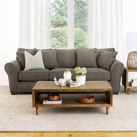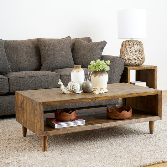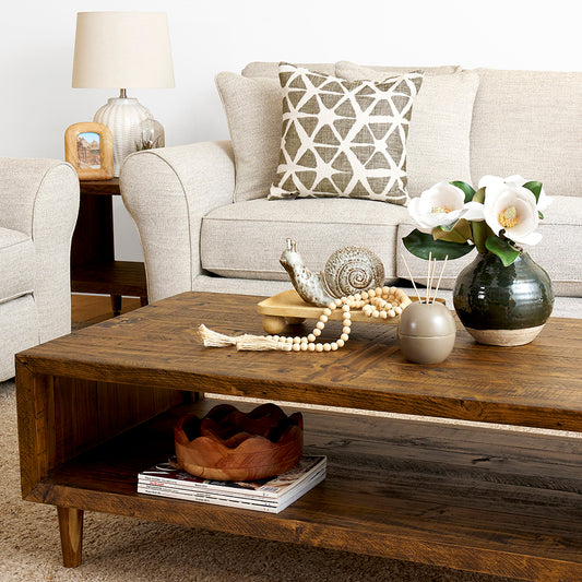 This coffee table has a generous shelf underneath for storage and is perfect for family living.