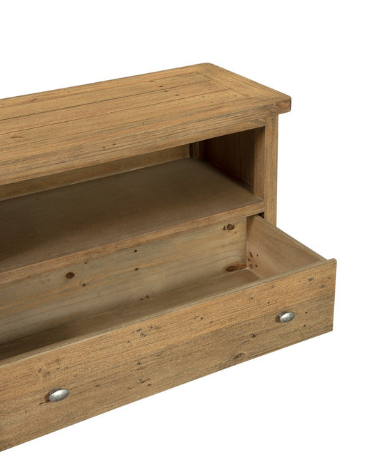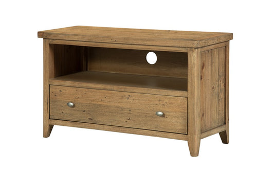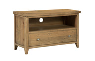This compact TV has one drawer for incognito storage and an open shelf for devices, remote controls, etc.