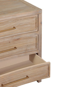 Crafted from a blend of new pine and durable MDF, this chest is both sturdy and elegant, featuring long brass handles for a refined touch. A stylish must-have for any modern bedroom.