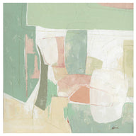 Soft and harmonious, featuring shades of green, cream, white, and subtle hints of pink or peach, creating a calming visual effect.