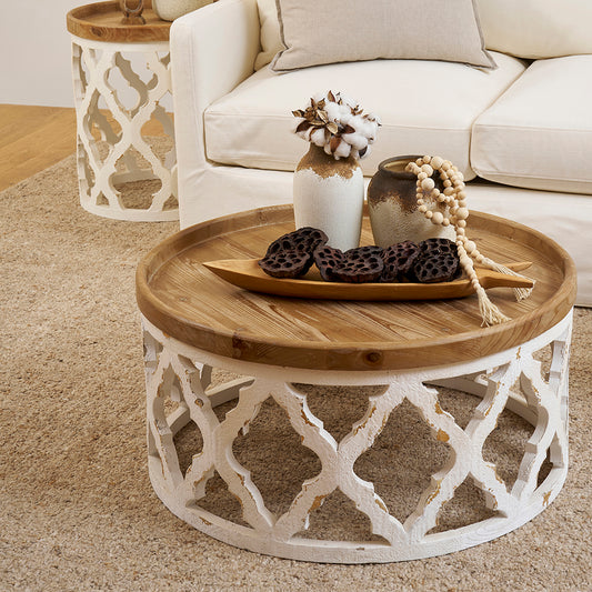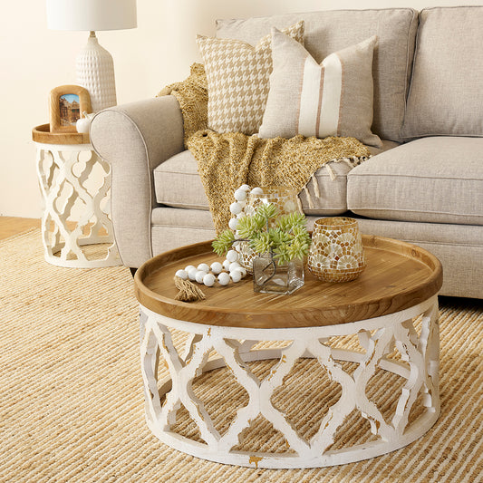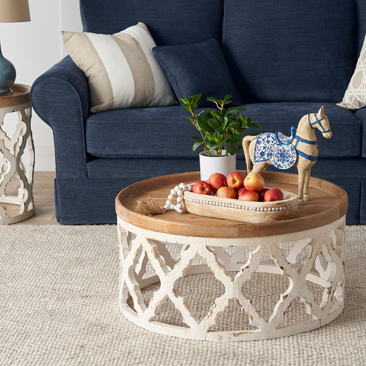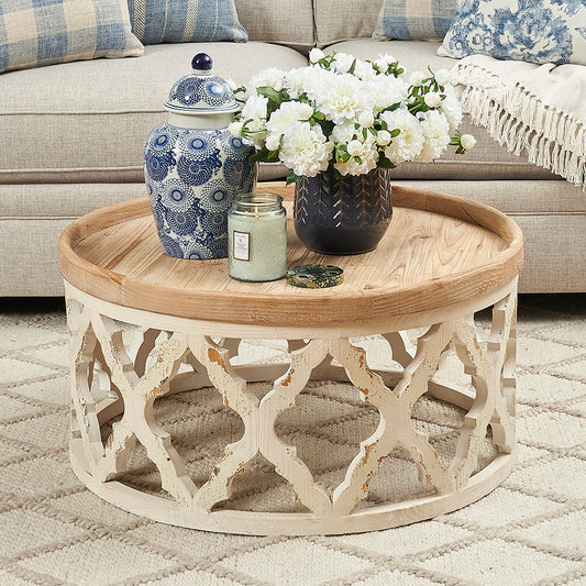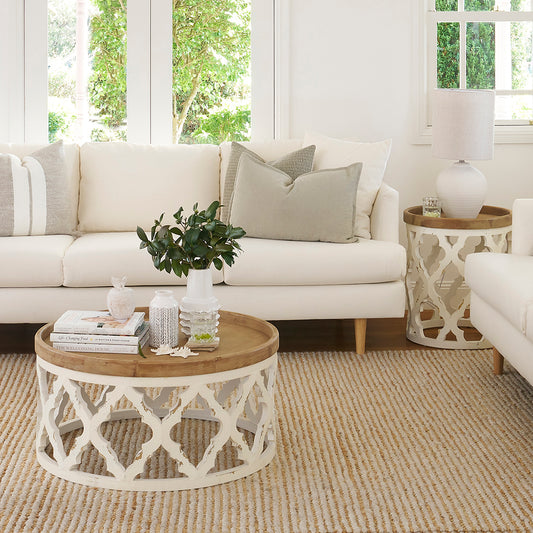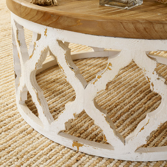 A lattice pattern with a weathered white finish supports the round whitewashed timber top of this stunning coffee table.