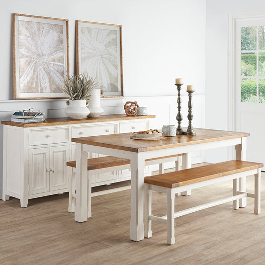 Our extensive, robust and versatile Tuscan collection is made from carefully selected solid, reclaimed pine shipping pallets. The pieces are finished with a honey-coloured stain and our signature ivory wash.