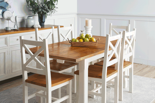 This dining table comfortably seats six people when extended. For a larger alternative, try our popular Tuscan large extension table. For the smoothest operation have one person at each end when extending or closing the table.