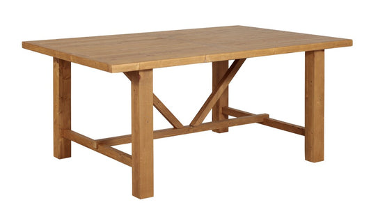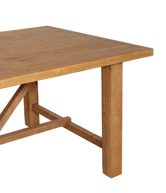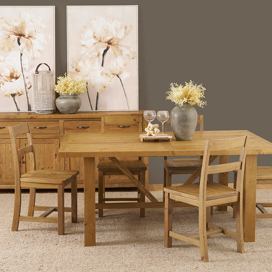 This collection features diagonal supports on table bases and traditional country style top profiles. Nail holes, timber knots, colour variations and timber block patches are common and are not considered a fault.