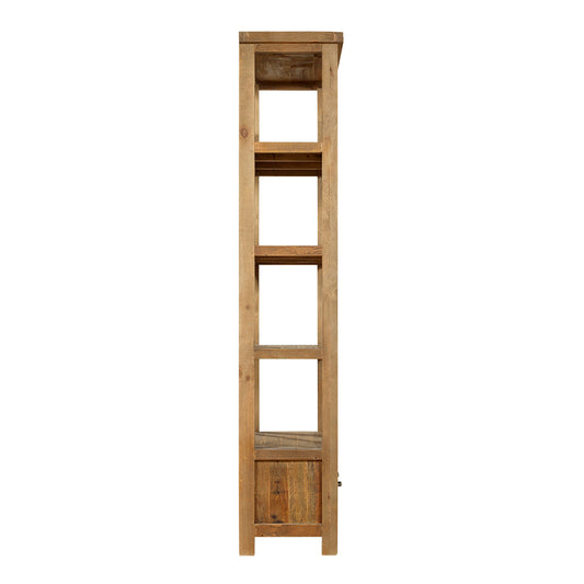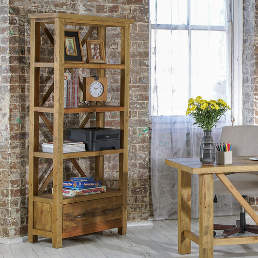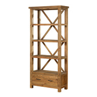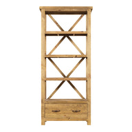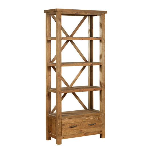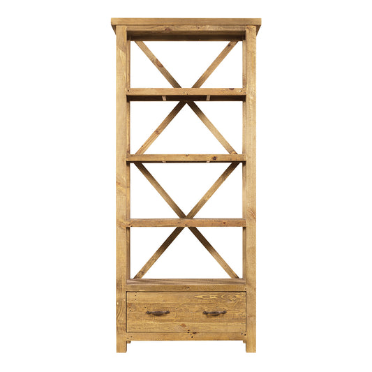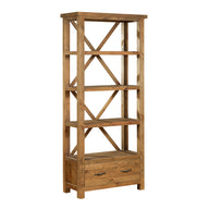 This bookcase features diagonal supports, a single drawer for storage, and a traditional country style top profile. Nail holes, timber knots, colour variations and timber block patches are common and are not considered a fault.
