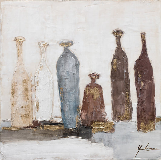 The painting depicts a collection of six bottles of varying shapes and sizes. The bottles are arranged in a row against a neutral background. The colours used in the painting are predominantly earth tones such as beige, brown, and white, with one bottle painted in a muted blue. The texture of the painting is rough and layered, giving it a three-dimensional appearance. The artist has used a combination of thick brushstrokes and palette knife techniques to create a sense of depth and texture. The overall style of the painting is abstract and minimalist, focusing on the form and texture of the bottles rather than intricate details.