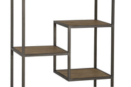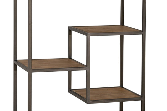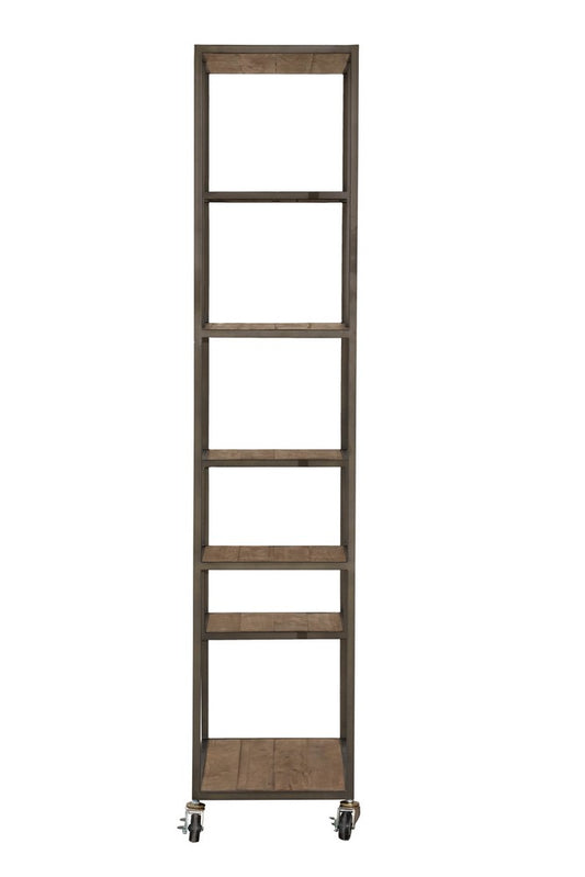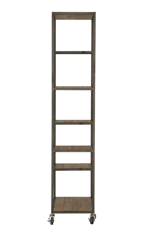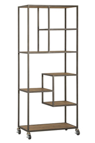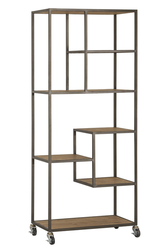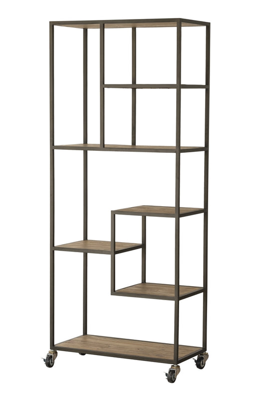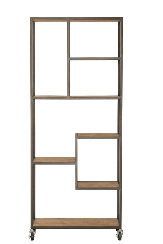 This versatile timber and antique bronze metal bookcase is on castors and has compartments of varying size.