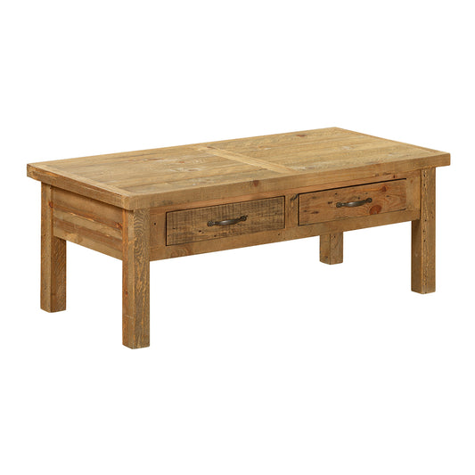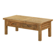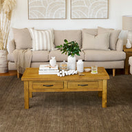 This coffee table features two double-sided drawers and a traditional country style top profile. Nail holes, timber knots, colour variations and timber block patches are common and are not considered a fault.