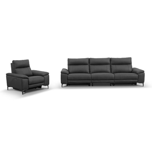 This set consists of one powered recliner armchair, and one 3 seater sectional sofa. The end seats on the 3 seater are powered recliners.  The middle seat is not a powered recliner.