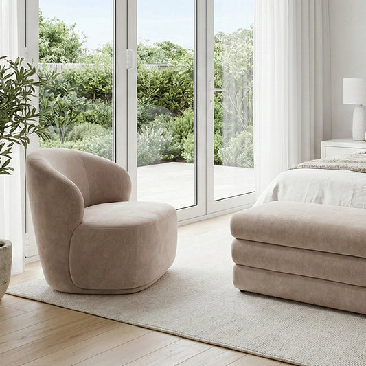 Sink into cloud-like comfort with this chic, rounded lounge chair, designed to be as inviting as it is stylish. Its smooth, curved silhouette and velvety soft taupe upholstery create a warm, contemporary vibe that instantly elevates any living space. Perfect for a bedroom, cosy reading corners or as a statement piece in your lounge, this chair blends modern minimalism with irresistible comfort.